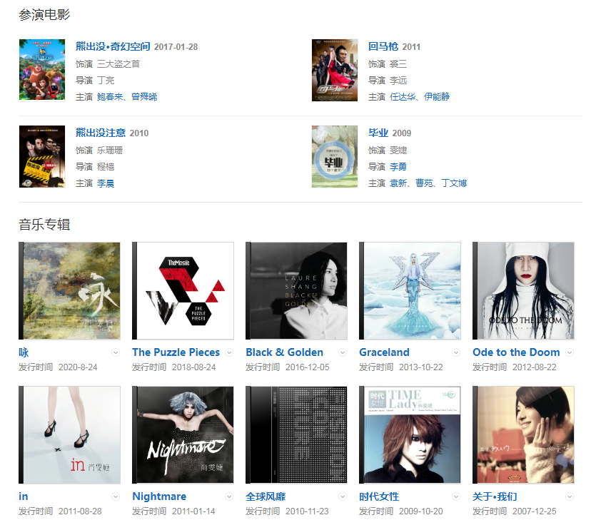 2010年,發(fā)行音樂專輯《全球風(fēng)靡》,憑該專輯獲得中國TOP排行榜年度最佳女歌手獎(jiǎng)。同年,主演動(dòng)物親善電影《熊出沒注意》,憑該片獲得優(yōu)酷影視盛典電影類最佳新人獎(jiǎng) 。