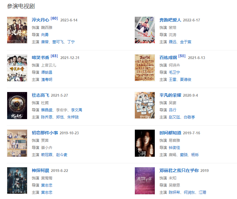 代表作品:天外飛仙、雪在燒、新一剪梅、后宮、X女特工、真愛惹麻煩、平凡的世界、時間都知道